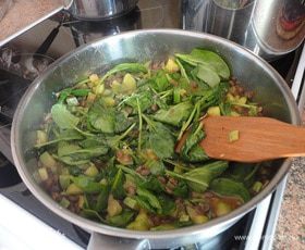 Добавить шпинат, сливочное масло, соль, перец и проварить 5 минут до готовности.