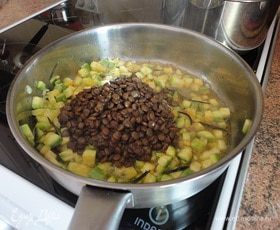 На оливковом масле обжарить чеснок, тимьян и кабачки в течение 3 минут и добавить чечевицу.