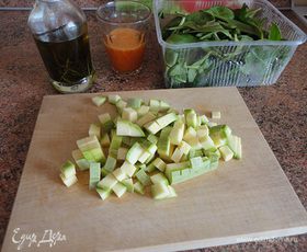 Отварить чечевицу до готовности. Кабачки нарезать средними кубиками.