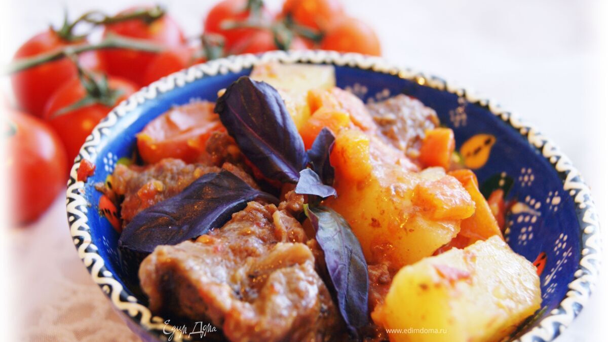 Добавить картофель, черри и листья базилика к мясу, готовить на среднем огне еще 20 минут - Шаг 10