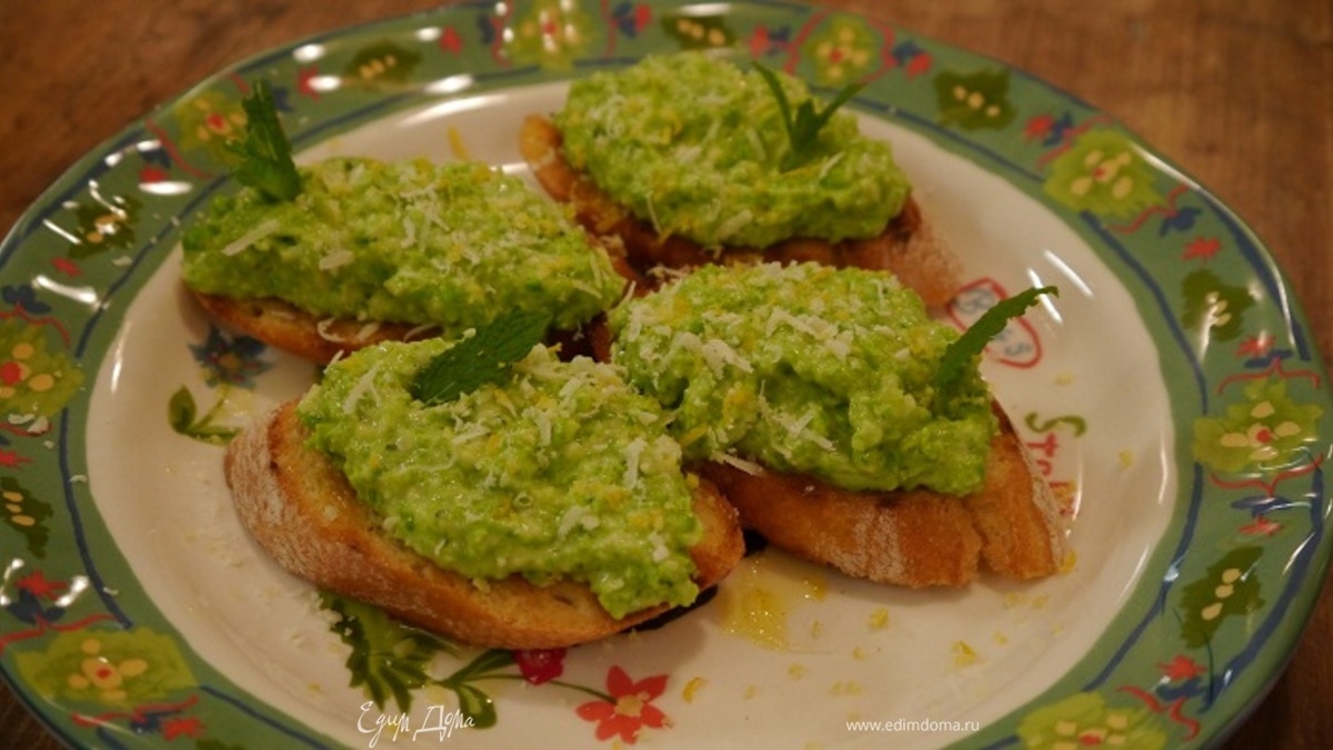 Поджаренный хлеб сбрызнуть оставшимся оливковым маслом и разложить сверху взбитый горошек с творогом. - Шаг 6