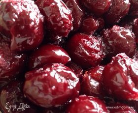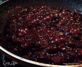 В сковородке растопить сливочное масло и добавить вишню с выделившимся соком.Томить на маленьком огне до почти полного выпаривания.