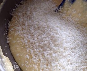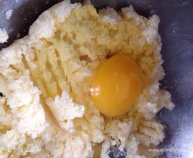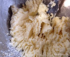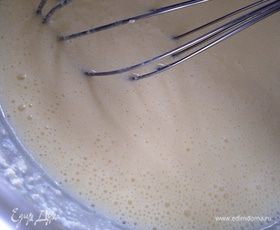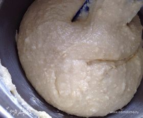 Просеять муку с разрыхлителем и, постепенно добавляя, замесить тесто (консистенция густой сметаны!).