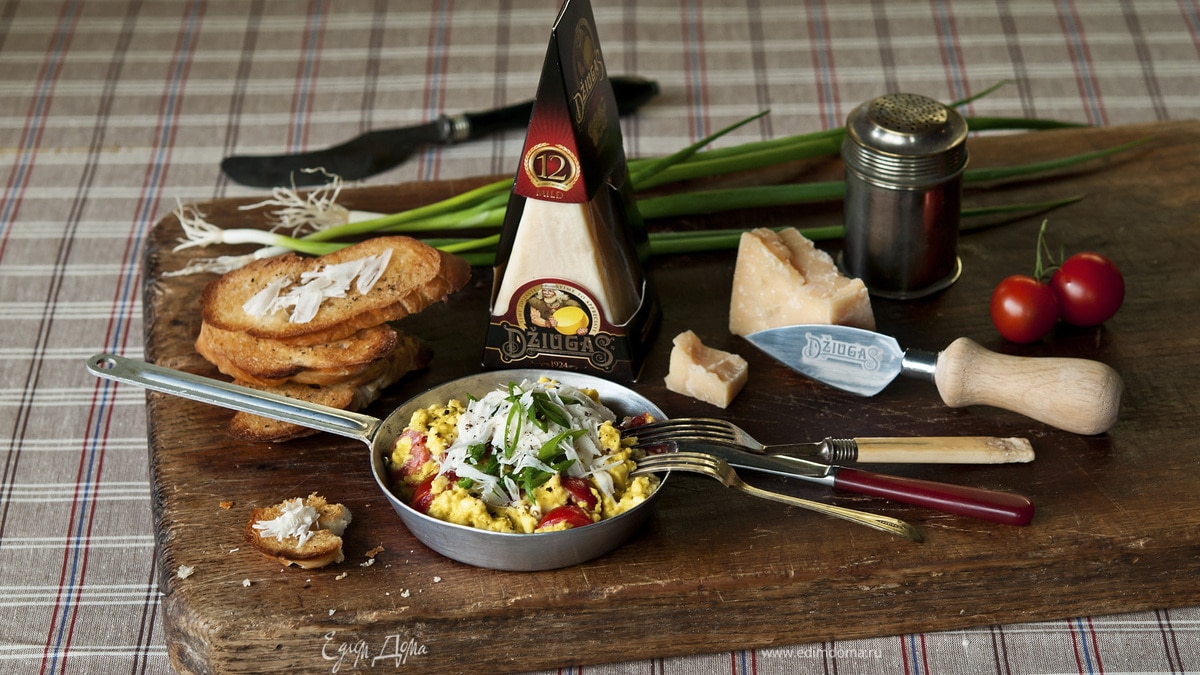 Подавайте болтунью на тостах с зеленым луком, листьями салата и хлопьями сыра Джюгас.
