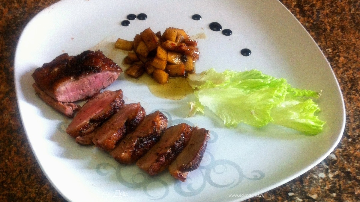 Утиную грудку со стороны кожи надрезать. Удалить сухожилия. Посолить, поперчить. - Шаг 1