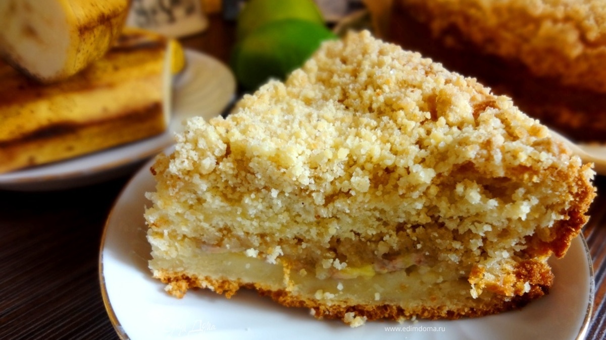 В форму выложить половину теста, сверху распределить все бананы. Присыпать половиной от общей массы крошки. - Шаг 7