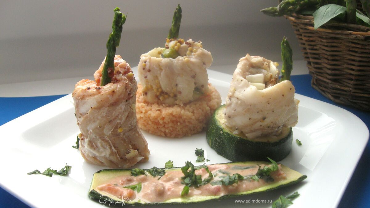 Сварить кус- кус с добавлением небольшого количества воды и пассированных томатов. Посолить. После остывания через кольцо оформить в виде невысокого цилиндра кус – кус. Другой цилиндр на тарелке – кружок цукини. На тот и другой поставить рулеты из трески ( если необходимо, подрезать для устойчивости нижнюю часть трески). Третий рулет поместить без дополнительных компонентов в основании.