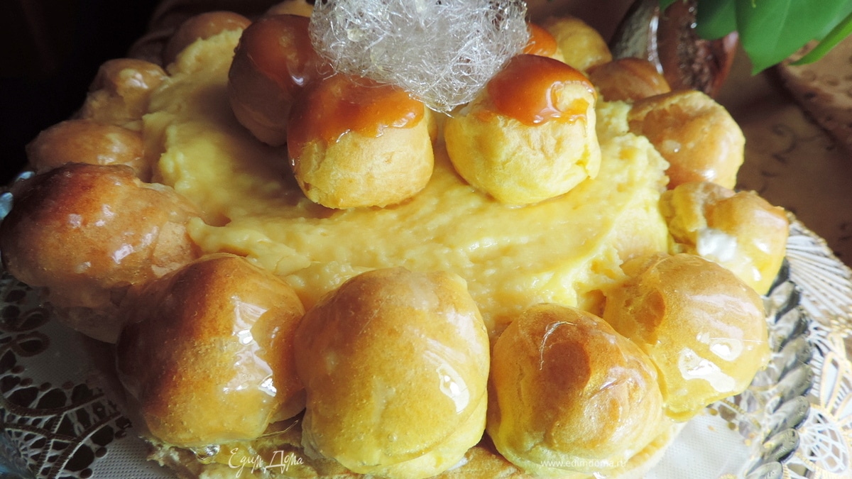 Когда все кольцо будет заполнено пирожными, выливаем в центр заготовки заварной крем, который уже загустел и начал застывать. Теперь торт должен часок-другой провести в холодильнике. Украшать торт нужно непосредственно перед подачей к столу, поскольку карамельные украшения мгновенно тают в холодильнике. Я украсила торт оставшимися пирожными и шариком из карамельных нитей. Можно вместо шарика украсить торт карамельными нитями. - Шаг 20