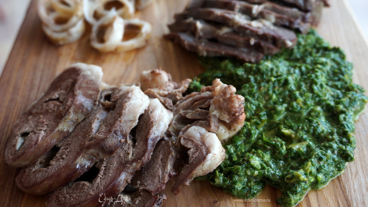Добавить оливковое масло (можно больше, если хотите, чтобы соус лился), посолить по вкусу (слегка). Подавать к мясу или овощам. Здесь бараньи потроха (предварительно их просто отварили, даже без соли). Приятного аппетита!