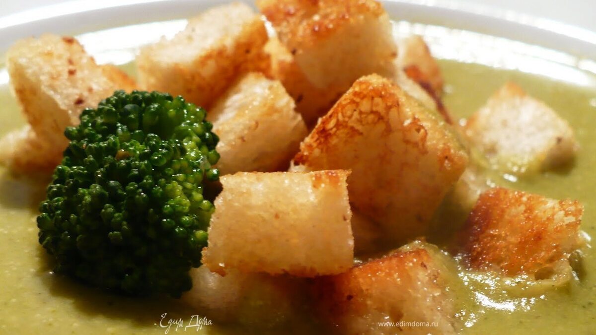 - Шаг 6Подавать суп в мисках или тарелках, украсив соцветиями брокколи и сухариками домашнего приготовления. Вместо домашних сухариков можно взять вчерашний хлеб, нарезать его кубиками и слегка обжарить на оливковом масле. Как вариант суп ещё можно подать с чипсами из пармезана с миндальными хлопьями или шапочкой из взбитых сливок или молока, крем-фрешем с зеленью или в диетическом варианте "без ничего". Приятного согревающего аппетита!