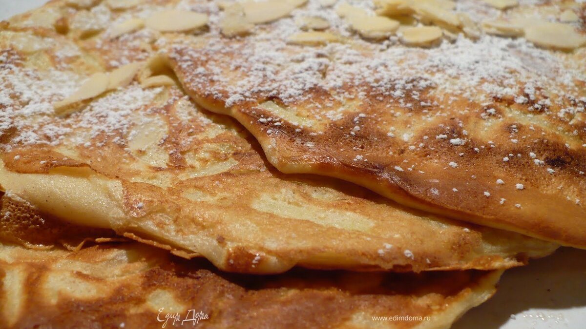 - Шаг 4Подавать блины с пылу, с жару, присыпав сахарной пудрой и миндальными лепестками. Лепестки можно предварительно подсушить на сухой сковороде или в духовке. Доброго утра и приятного аппетита!