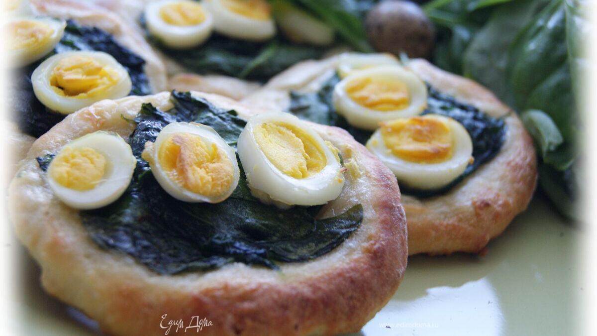 Нежнейшее творожное тесто в сочетании с молодыми листиками шпината (надо срочно пользоваться сезоном молодой сочной зелени) и перепелинные яички дополняют это трио! Полезный и вкусный завтрак!!!