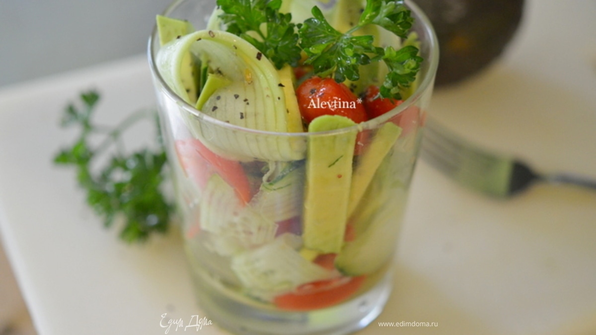 Все овощи и авокадо выложим в бокал, сбрызнем смешанным яблочным уксусом. Подаем тут же, украшаем зеленью по желанию. Приятного аппетита и вкусного снижения веса.