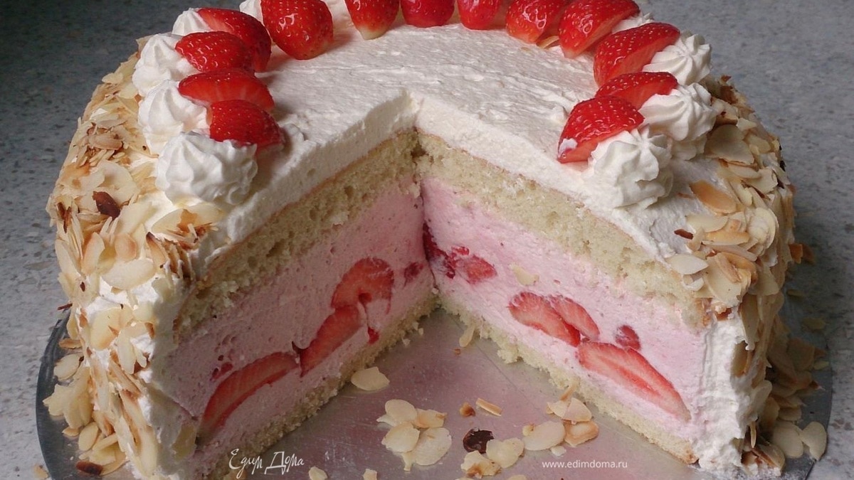 500 мл сливок крепко взбить с загустителем, 75 г сахара и 1 пакетиком ванильного сахара. 1/4 крема наполнить кондитерский мешок со звездообразной насадкой. Другой частью крема обмазать весь торт. Затем по бокам обсыпать миндалем. Украсить торт сливками и оставшейся клубникой. - Шаг 5