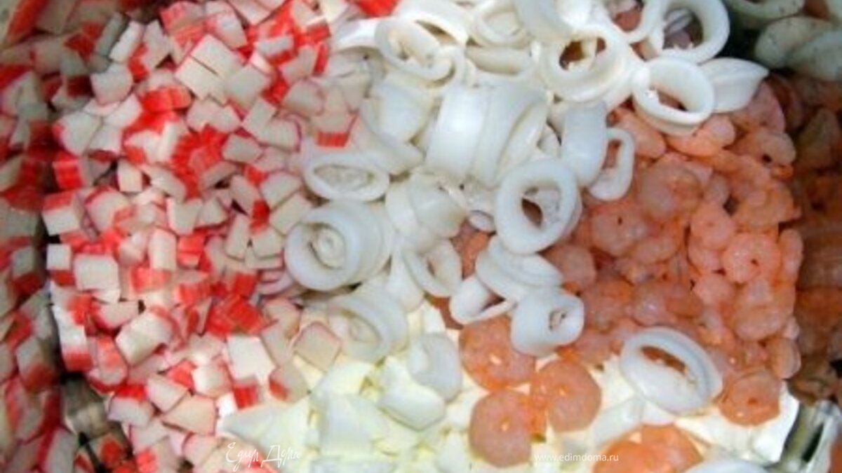 - Шаг 1Отвариваем яйца, охлаждаем, отделяем белок от желтка, нарезаем белок. Желток можно оставить для украшения. Варим креветки в слегка подсоленной воде. Я выбирала креветки меленькие, чтоб потом их не резать. Затем в кипящую воду бросаем, предварительно нарезанных на кольца, кальмары. Самое главное-не переварить,я думаю можно заменить их на консервированные.Нарезаем крабовые палочки. Все ингредиенты перемешиваем с майонезом,украшаем желтком и икрой.