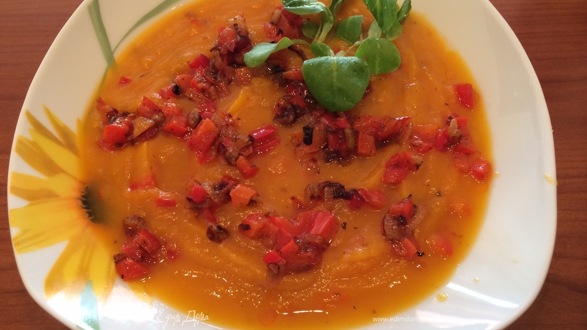 Поставьте кастрюлю обратно на средний огонь, добавьте лук и перец (если вы не измельчали их вместе с тыквой) и доведите до слабого кипения. Добавьте соль по вкусу. Через 2-3 минуты, выключите огонь и дайте настояться 20-30 минут. Можно подавать! В рецепте можно не использовать перец - в этом случае после измельчения можно добавить немного сливок и довести до кипения! Приятного аппетита!