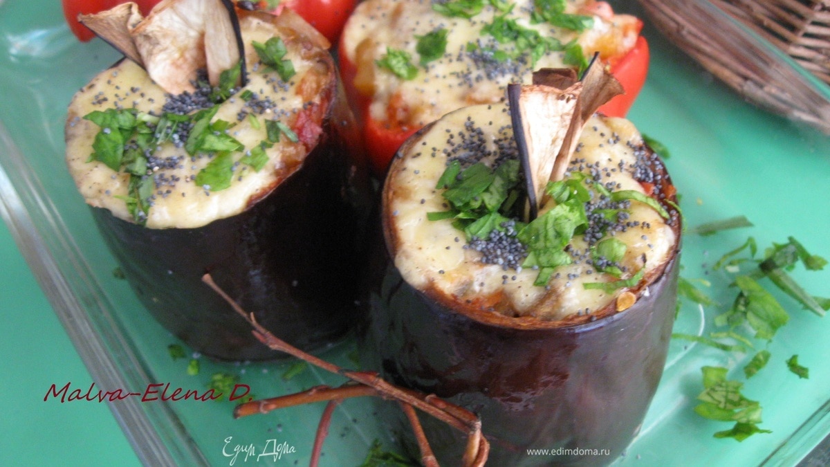 Один красный перец разрезать на половинки вдоль, освободить от семян, завернуть в фольгу и отправить в разогретую духовку на 35 минут. Запекать при температуре 160 градусов. Туда же отправить пластинки баклажан, которые положить на противень на бумагу для запекания. Готовность их проверьте через некоторое время, чтобы они не подгорели. Перец вынуть, развернуть, ополоснуть холодной водой, нарезать на кубики, добавить к начинке из овощей. Нафаршировать баклажаны начинкой. У двух перцев шаровидной формы срезать «крышечки», нафаршировать перцы. - Шаг 10