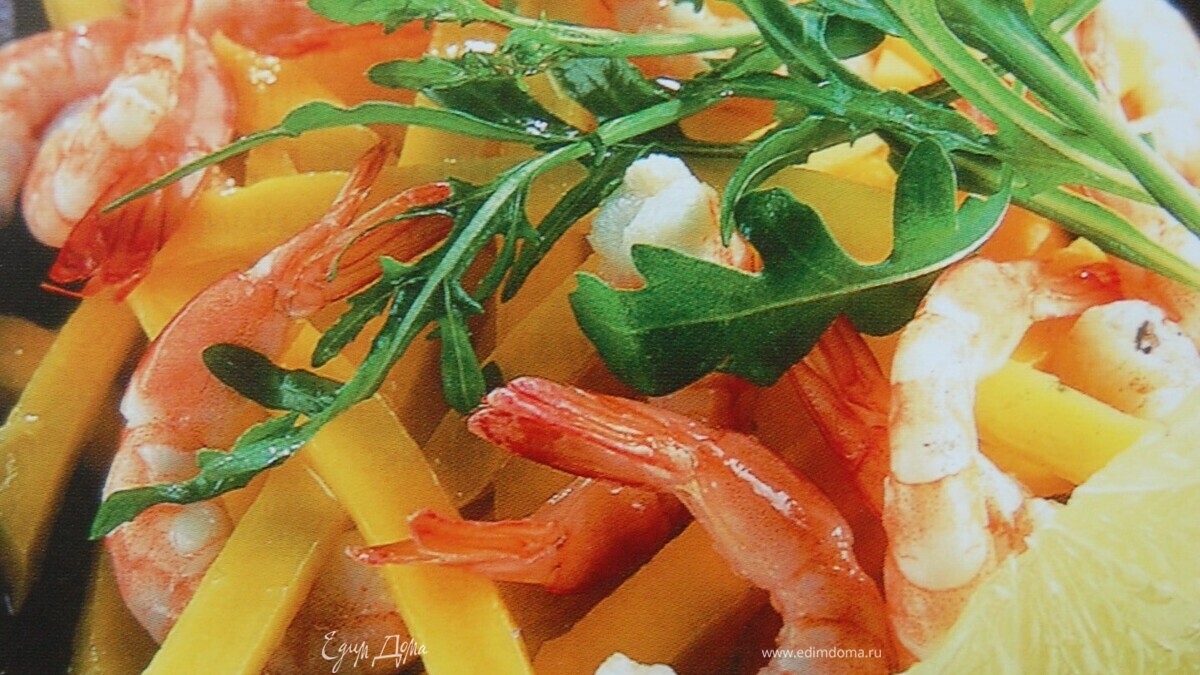 1.Острый перец вымыть и нарезать кружочками.Листики кориандра вымыть и обсушить.Манго очистить и нарезать соломкой. 2.Выдавить сок из зубчика чеснока,добавить сах.песок,сок лайма и перемешать, пока сахар не растворится. 3.Добавить манго, зеленый перец,отварных креветок в миску и перемешайте.Сразу подавайте к столу.Перед подачей посыпать кориандром и красным молотым перцем.