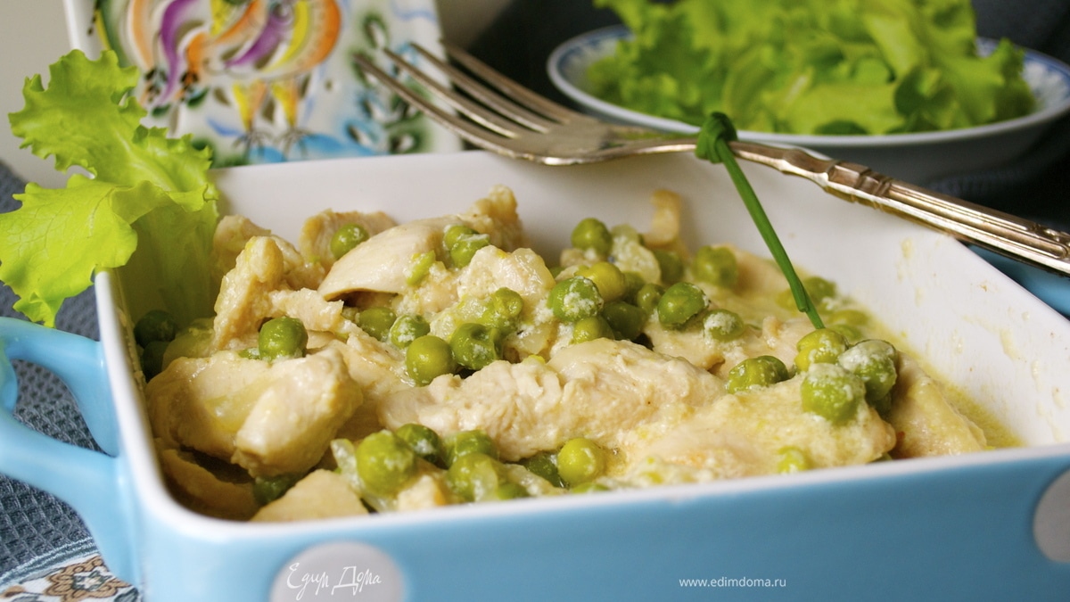 Такая НЕЖНАЯ курочка очень нравится деткам! (ну, конечно, не только им! ) Блюдо очень простое в приготовлении, а потому еще больше подходит занятым мамам! ))) В данном рецепте я положила к курочке замороженный зеленый горошек (еще лучше, если Вы сможете найти свежий молодой горошек - его сезон как раз начинается! )