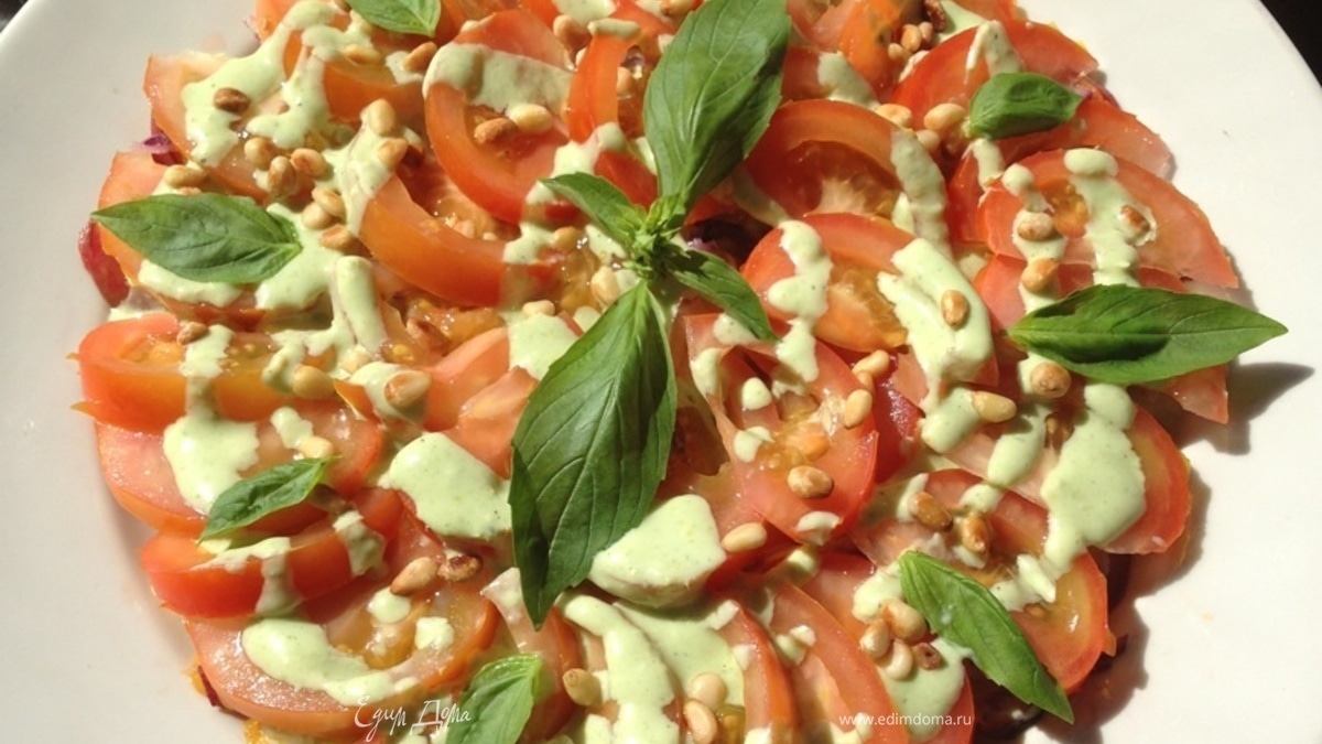 Посыпаем салат оставшимися кедровыми орешками, украшаем листиками базилика и подаем!!! Угощайтесь!!