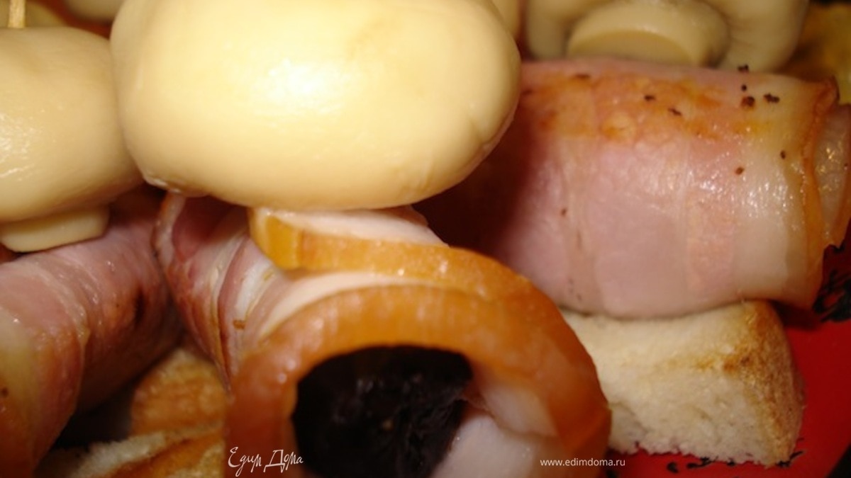 - Шаг 1Чернослив обдать кипятком и дать немного постоять. Слить воду и обсушить бумажным полотенцем. В тонко нарезанный полосками бекон завернуть чернослив, перевязать нитью, и обжарить до золотистого цвета. Дать немного остыть и снять нить. Для украшения можно сверху на рулетик приколоть маринованный гриб и блюдо выложить зеленью салата.