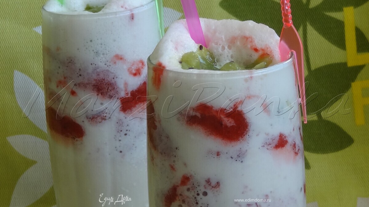 Коктейль получается с пышной пеной, со множеством пузырьков воздуха, очень ароматный, благодаря клубнике, со вкусным кисленьким послевкусием за счет киви. То, что надо летом! ![]()