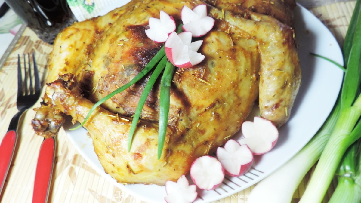 Даем курочке немного остыть, украшаем по своему вкусу и подаем к столу.