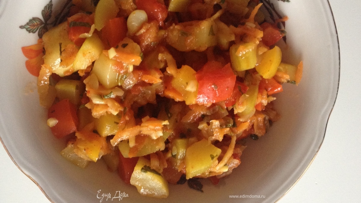 - Шаг 3Добавить мелко нарезанные кубиками кабачки и болгарский перец, томаты, посолить, накрыть крышкой, тушить на слабом огне 15-20 мин. В конце добавить специи и кинзу.