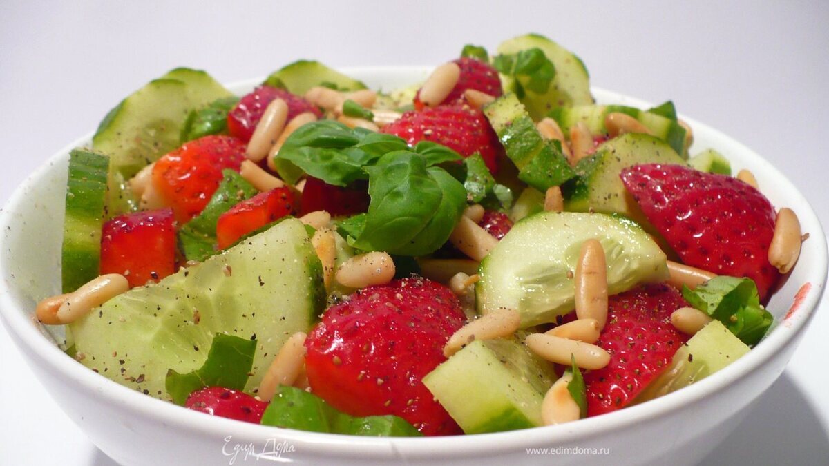 Клубнику помыть, хвостики убрать, слегка обсушить. Клубнику можно порезать кольцами, половинками, четвертинками или небольшими кусочками. В зависимости от того, как нарезан огурец.