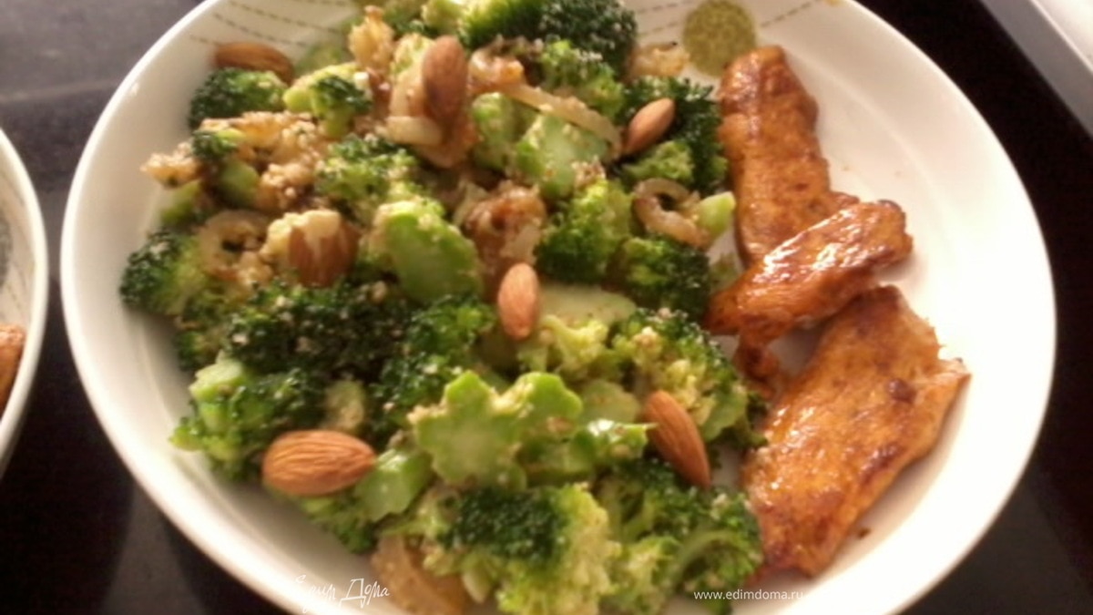 Смешать брокколи и жаренный лук, добавить миндаль и заправку. Приятного аппетита.