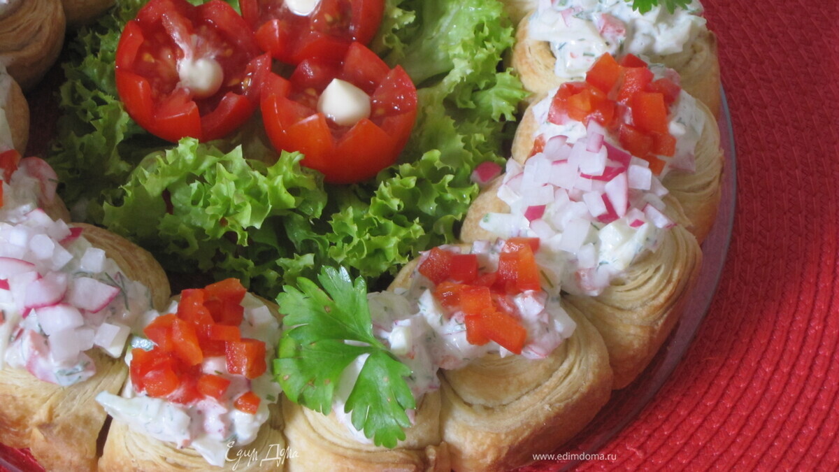 Разложить получившийся салат на испеченный венок, дать постоять минут 15 и подавать на стол.