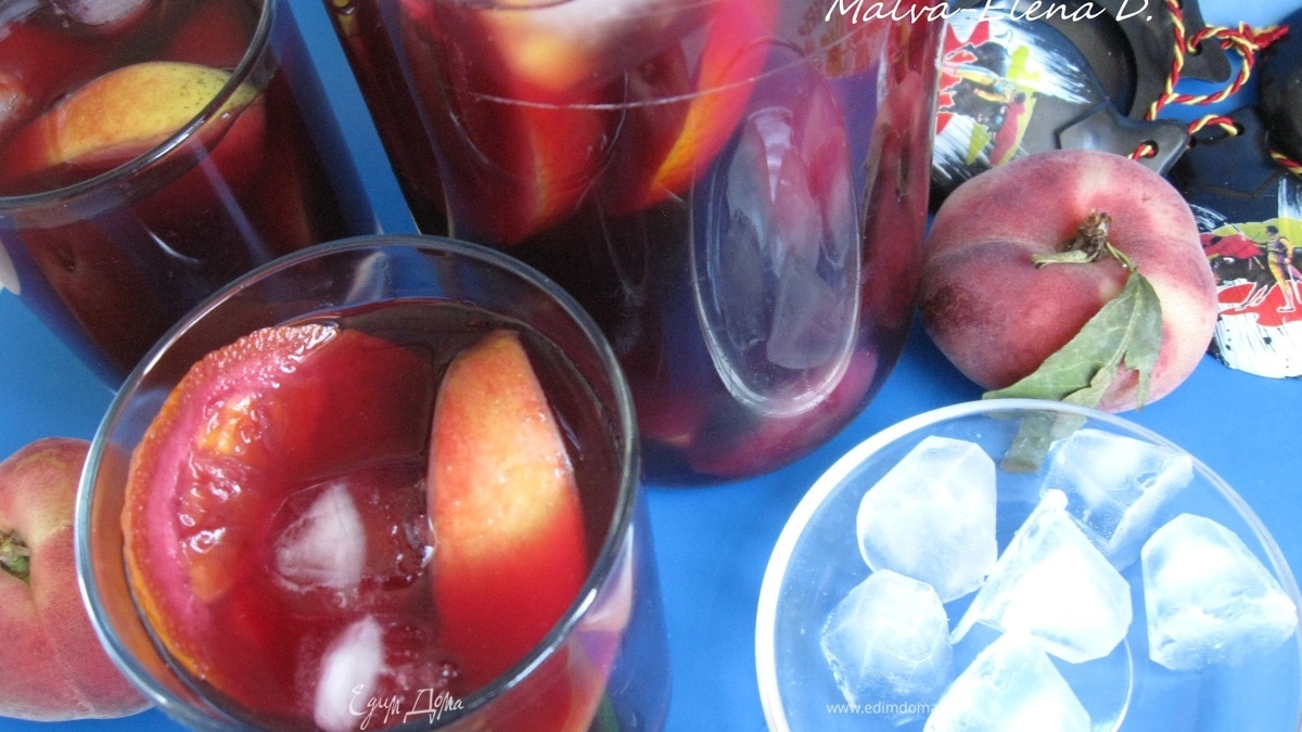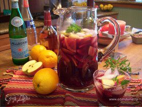 Хороший летний день, солнце, предчувствие скорого отпуска или воспоминания о нем. Может быть, вы его провели в Каталонии, в прекрасной Барселоне…Вот и решила я приготовить для вас сангрИю ( от исп. sangría от исп. sangre — кровь). Она появилась очень давно. Сборщики фруктов носили с собой бурдюки с красным вином, разбавленным ключевой водой. В тот же бурдюк они выдавливали сок свежих цитрусовых. Происхождение этого напитка овеяно легендами, одно несомненно - это самый популярный слабоалкогольный напиток в Испании. Те, кто бывали в Испании, наверняка попробовали его, он незаменим в жару. Не обязательно брать дорогие марочные вина, достаточно взять хорошее сухое красное столовое вино. У меня это испанское сухое красное столовое вино из винограда сорта Темпранийо с ароматом красных ягод и терпким фруктовым вкусом.. Строгого рецепта сангрии нет, как и чёткой грани между ее вариантами. Всё зависит от фантазии, возможностей, семейных традиций. В качестве подсластителя в нее добавляют не только сахар, но и мед. Специи варьируются. Летом рекомендуется подавать напиток хорошо охлаждённым, зимой — подогретым, с корицей, гвоздикой и мускатным орехом. Можно добавить газированную воду, придавая напитку игристость, или приготовить сангрию вообще на основе белого вина («белая» сангрия). Существует обычная, или « тихая» сангрия. Её особенность состоит в отсутствии содовой и в обязательном присутствии цитрусовых и винограда. «Тихая» сангрия обладает лёгким и свежим кисловато-сладким вкусом с яркими виноградными и цитрусовыми оттенками. Во фруктовой сангрии среди фруктов могут встретиться не только лимон, апельсин, лайм, персик, яблоко, но и клубника, вишня, банан (добавляют за полчаса до подачи), дыня, кусочки ананаса. Классический набор фруктов : апельсин, яблоко, персик. Часто встречается соотношние вина и воды 1:1, вино не должно доминировать. «Игристая» сангрия делается на основе шампанских вин либо с содовой.