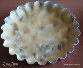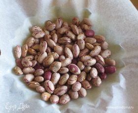 Сверху положить пергамент, насыпать фасоль и выпекать в разогретой до 180 °С духовке 12 минут. Убрать пергамент с фасолью и выпекать ещё 3 минуты.