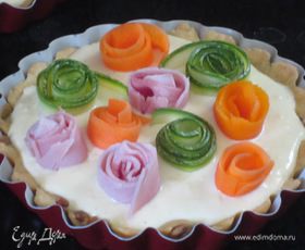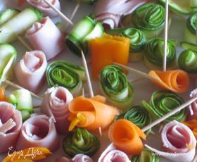 Овощи: цукини нарезать тонкими ломтиками с помощью овощечистки. Свернуть розочкой и скрепить зубочисткой. Из тонко нарезанной ветчины тоже сделать розочки и скрепить зубочисткой. Морковь отварить до полуготовности в кипящей воде, очистить овощечисткой, нарезать тонкими ломтиками, свернуть розочками и скрепить зубочистками. Каждый цветочек подрезать, чтобы они были одинаковой высоты.