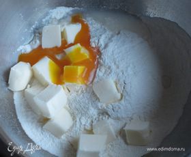 Муку просеять, добавить соль, перемешать. Ввести желток, 2 ст.л. ледяной воды, сливочное масло.....