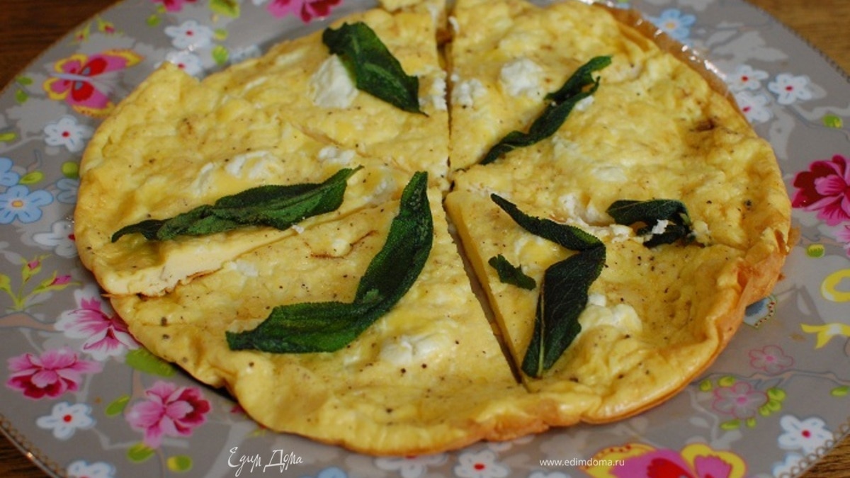 Готовую фриттату выложить на тарелку, украсить обжаренными листьями шалфея и подавать с гренками.