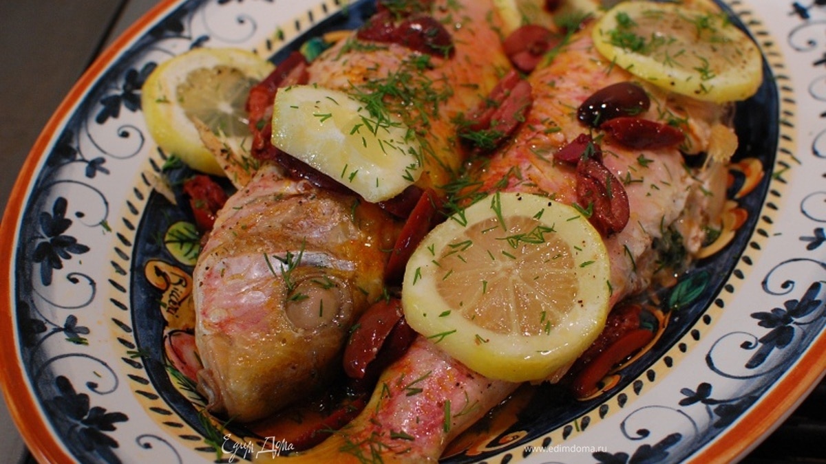 Рыбу выложить в противень, посыпать оливками, полить лимонным соком, сверху на рыбу выложить кружки лимона. - Шаг 7