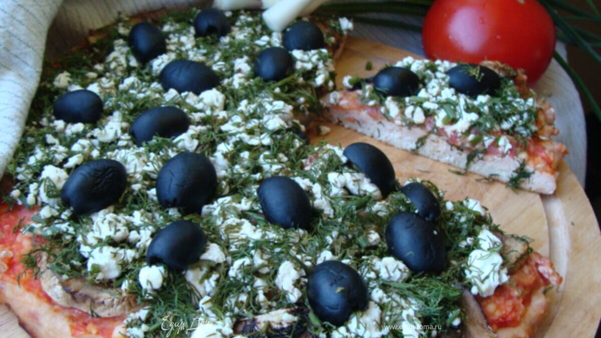 Отправить в духовку минут на 10. Затем творог и порубленный укроп перемешать, подсолить и выложить сверху. Оливки порезать пополам, выложить сверху. - Шаг 5