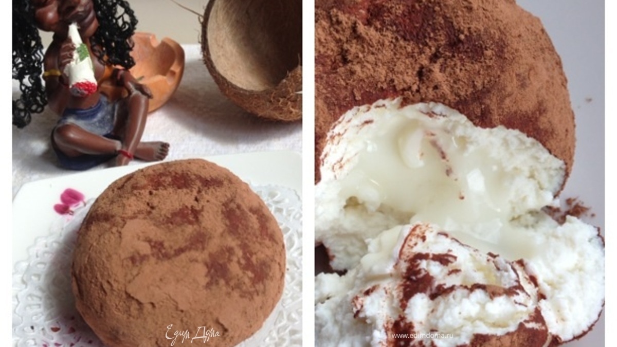 Обваливаем шары в какао и ставим минут на 10 в холодильник отдохнуть. Хотя можно и сразу подавать. Для обваливания также можно брать шоколадную стружку или смесь кокосовой стружки и растворимого кофе, здесь уже воля фантазии. Главное, чтобы по цвету шары напоминали кокосовые орехи. - Шаг 6