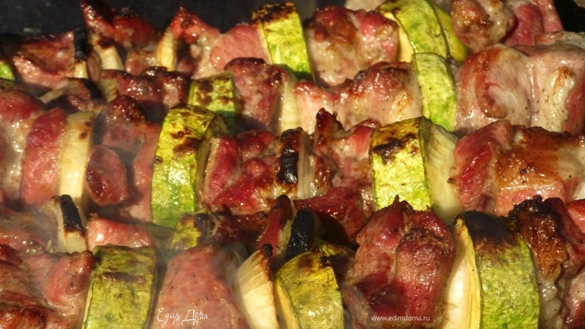 Подготовленное мясо равномерно нанизывайте на шампуры, перемежая колечками лука. Я добавила еще молодой кабачок, замариновав его в карри и апельсиновом соке. Нанизывать шашлык на шампуры следует вдоль волокон, предварительно смазав шампур растительным маслом. - Шаг 4