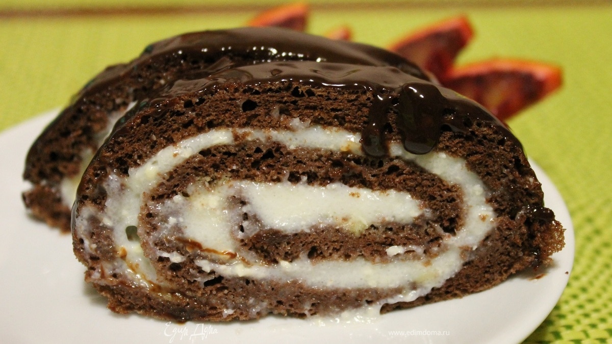 Остывший бисквит развернуть, смазать кремом, аккуратно завернуть и убрать в морозилку на 30 минут. Для глазури подогреть молоко до горячего состояния, к нему добавить масло и шоколад поломанный на кусочки. Перемешать до однородного состояния и покрыть рулет. Убрать в холодильник на ночь или на пару часов. Приятного чаепития!!!