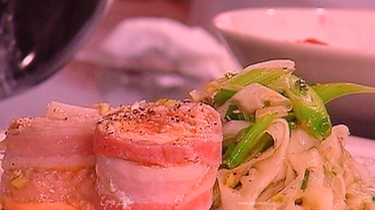 Рыбку скрутить в рулетики, каждый рулетик завернуть в 2 полосочки бекона. Прикрыть плёнкой и отправить на 20 мин. в холодильник мариноваться.