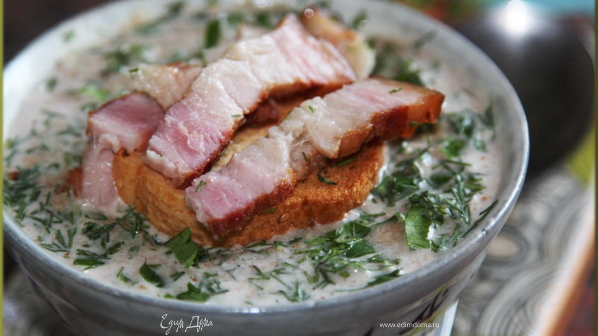 Собираем наше блюдо: наливаем в тарелку суп, нарезаем и добавляем зелень (мы любим побольше), сверху выкладываем подсушенный сухарик и на него нарезанную грудинку. Приятного аппетита!