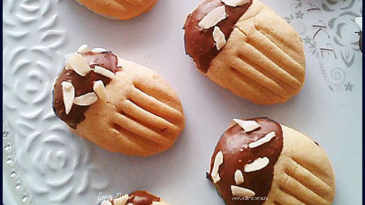 - Шаг 7Шоколад растопить на водяной бане и после того как печенье остынет, одной половинкой обмакнуть в шоколад. Сверху посыпать лепестками миндаля. Можно соединить две половинки печенья любой мармеладной начинкой.