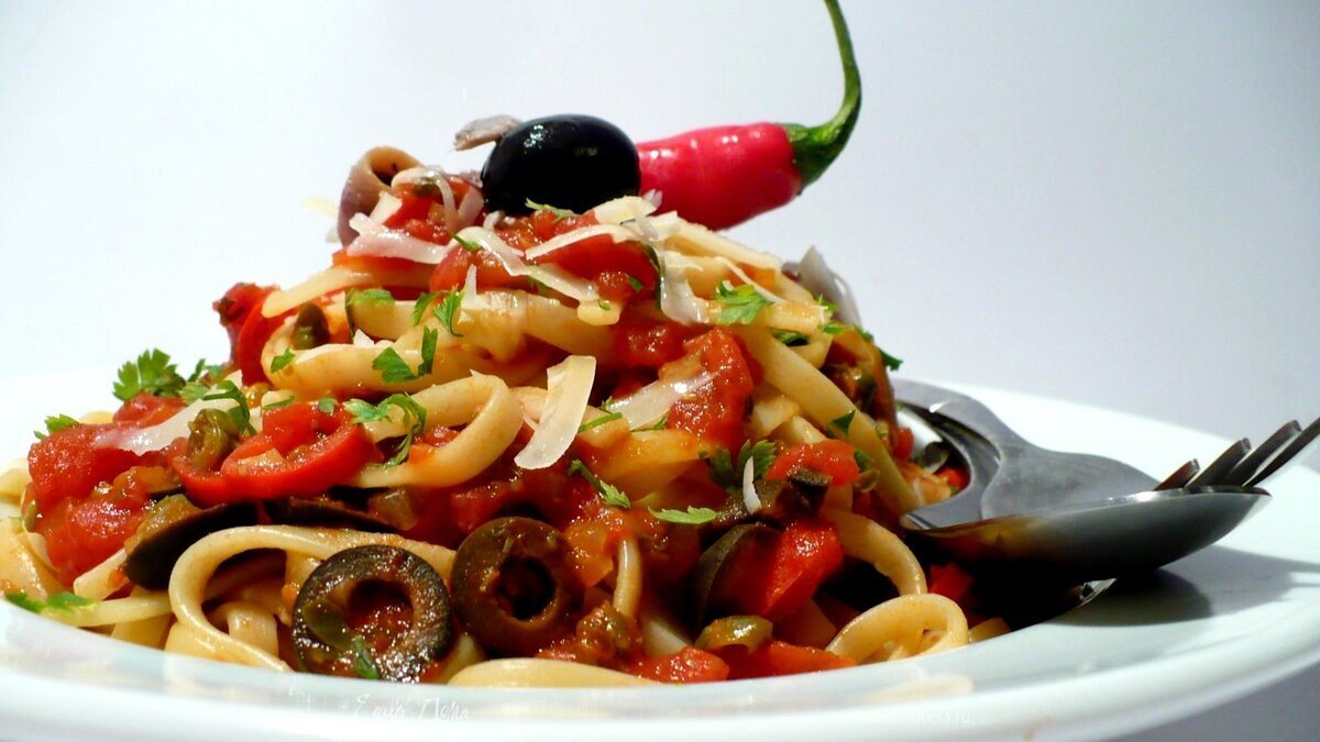 - Шаг 4Соединяем лингвини с готовым соусом, украшаем петрушкой, тёртым пармезаном и нарезанными кольцами чёрными маслинами. Кстати, маслины можно и сразу в соус отправить! Приятного аппетита!