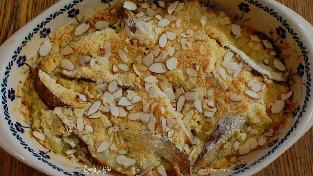 Миндальные лепестки подсушить на разогретой сковороде и посыпать готовый крамбл.