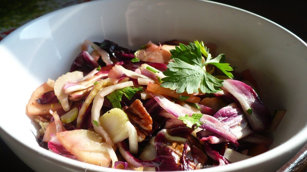 - ПодготовкаКому радиккио кажется слишком горьким, совет: замочить радиккио на час в тёплой воде с добавлением 1 ст.л. уксуса. Кто любит горчинку как и я, может сэкономить время и сразу приступать к готовке. Радиккио помыть, обсушить, порвать руками или нарезать специальным ножом для салатов.