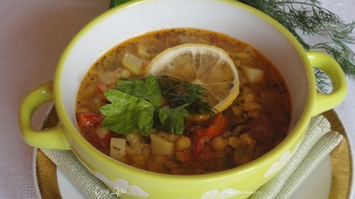 - Шаг 2К этому времени чечевица практически готова. Добавить к ней овощи, мяту, чабрец, перец, соль (по вкусу). Дать закипеть, выключить плиту и оставить настояться минут на 2--30, чтобы овощи передружились. При подаче полить свежевыжатым лимонным соком и взбрызнуть хорошим оливковым маслом.