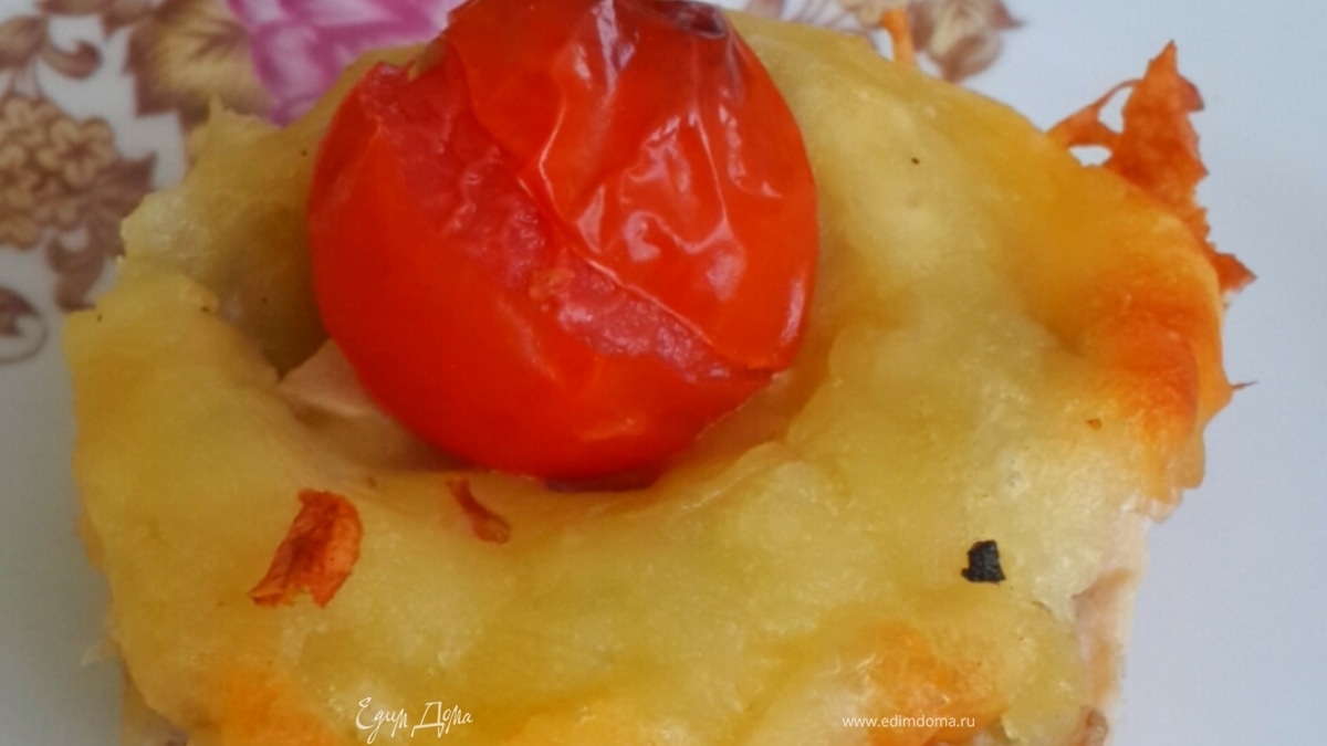 - Шаг 3Когда наши грибочки готовы выкладываем их на курочку в формочку. Трем много сыра сулугуни. Насыпаем на грибы много сыра и сверху ставим помидорку черри. Ставим в разогретую духовку 180 на 20 мин. Подаем как холодные так можно и горячими. Примечание!!! Сыр сам по себе соленый. Курицу и грибы солить не нужно. Только перчим.