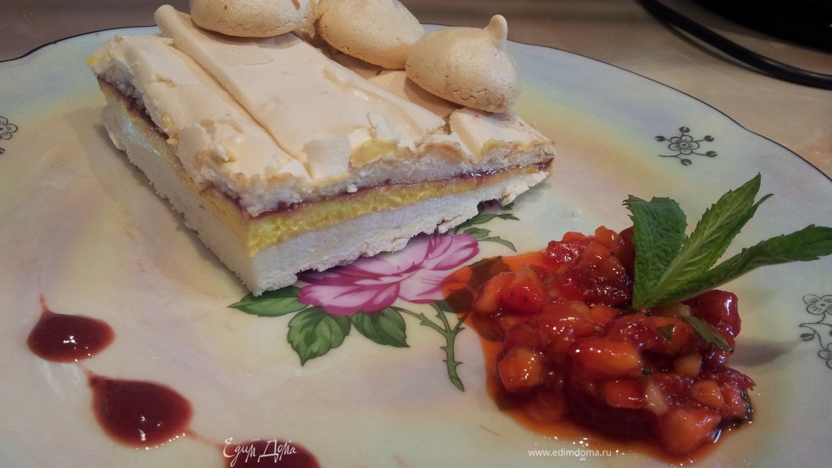 Одну остьвшую меренгу смазываем сперва кремом маскарпоне, затем тонким шаром винным соусом и накрываем второй. - Шаг 6Клубничная сальса: 50 грамм клубники режим мелкими кубиками , добавляем горсть нарезанного базилика,чайную ложку пудри и 2 столовой ложки сока лайма. Маринуем 15-20 минут. Если много сока слегка процедите.